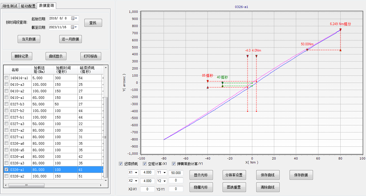 扭转刚度测试时,滞回曲线上扭矩为零时的回转角,与刚度、空程综合输出评定结果并绘制迟滞曲线,可独立输出误差曲线报告。
